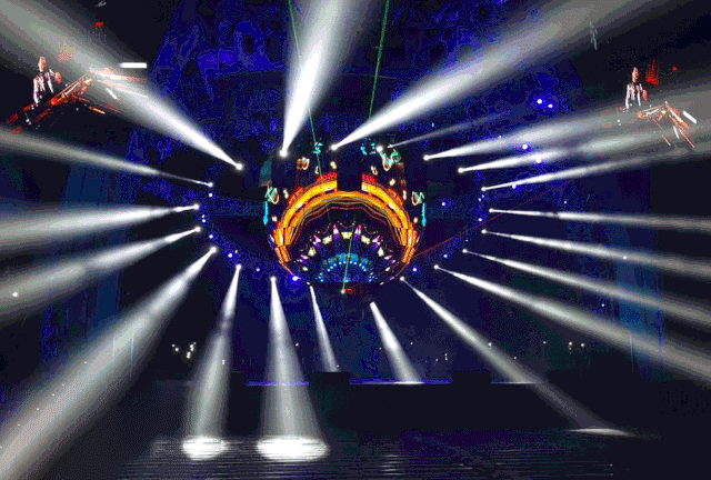 中央懸掛的高清多維球形屏幕,由512塊單體屏幕包裹而成,采用的是金立翔戶外P5間距LED屏,配合頂部的機械手裝置造型,為演出呈現精彩絕倫的立體特效,帶領觀眾穿梭時空,打造出既熱烈又炫酷的現場氛圍。